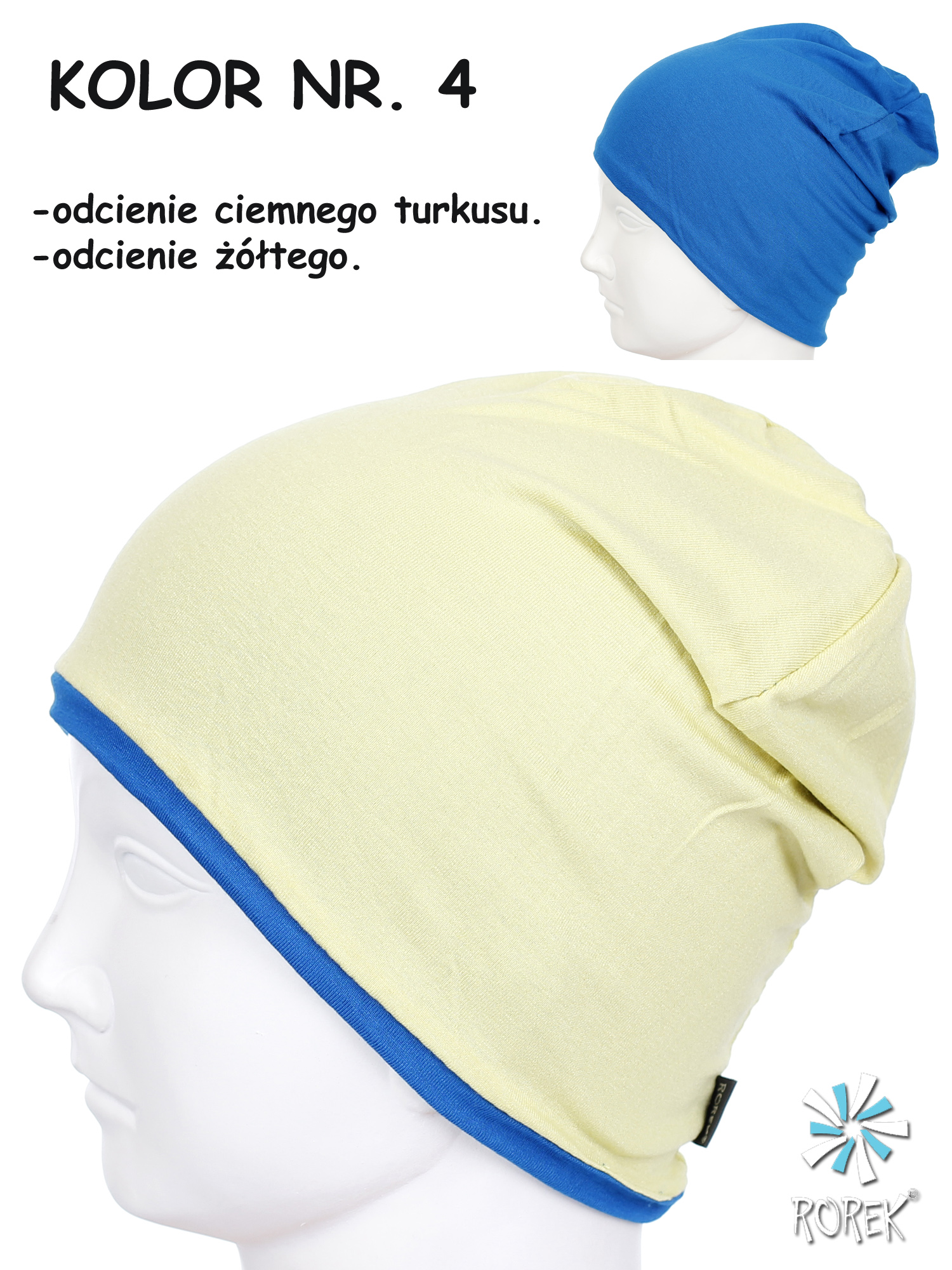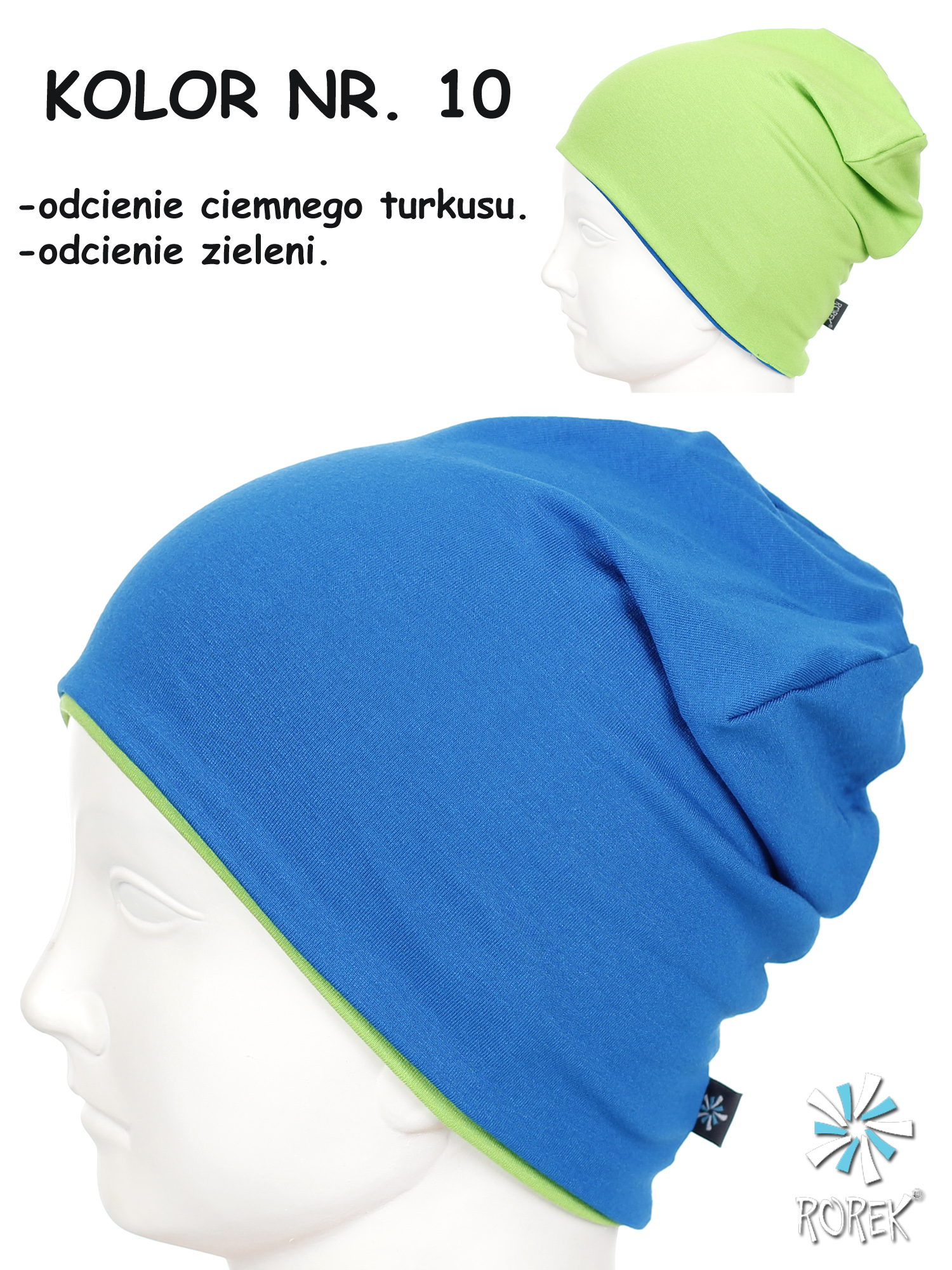 Czapka dziecięca dwustronna, wykonana z lekkiego i bardzo przyjemnego dla skóry dziecka materiału bawełnianego. Czapeczkę można nosić na 4 różne sposoby. Dostępna w kilku wersjach kolorystycznych.