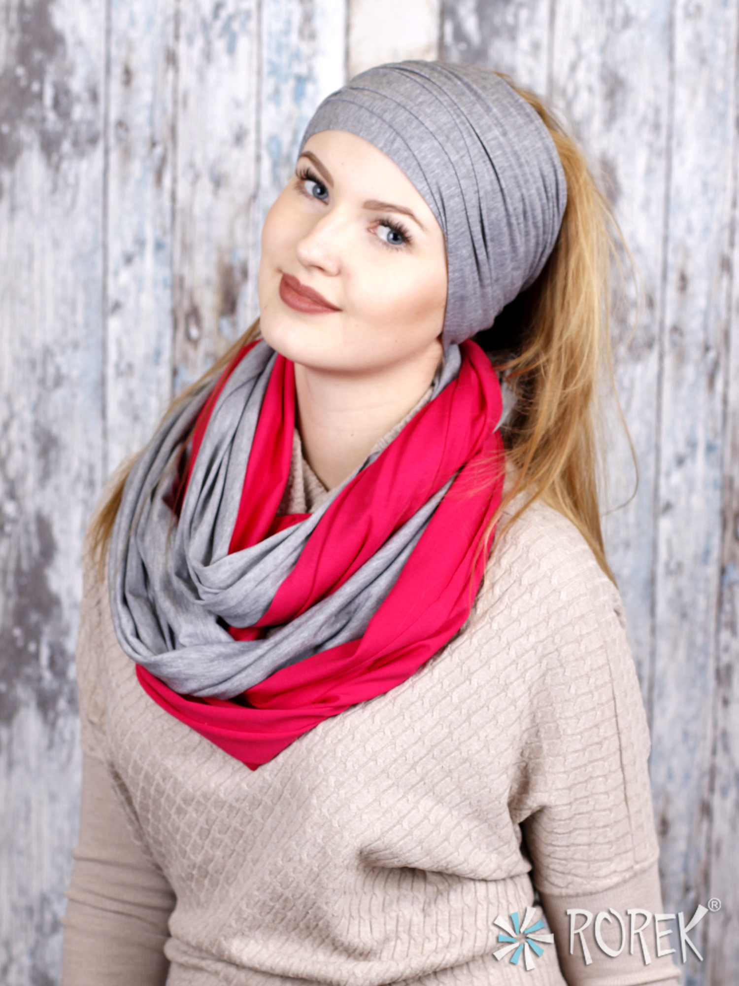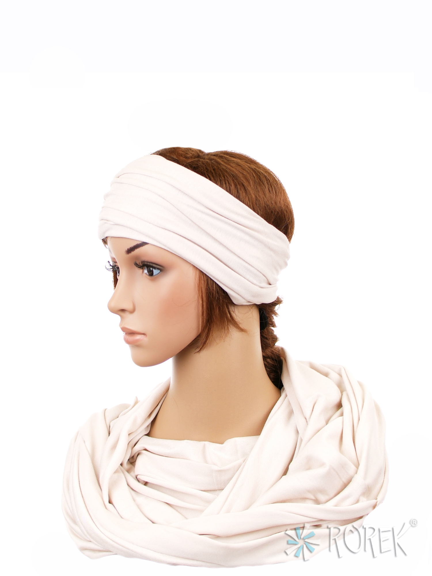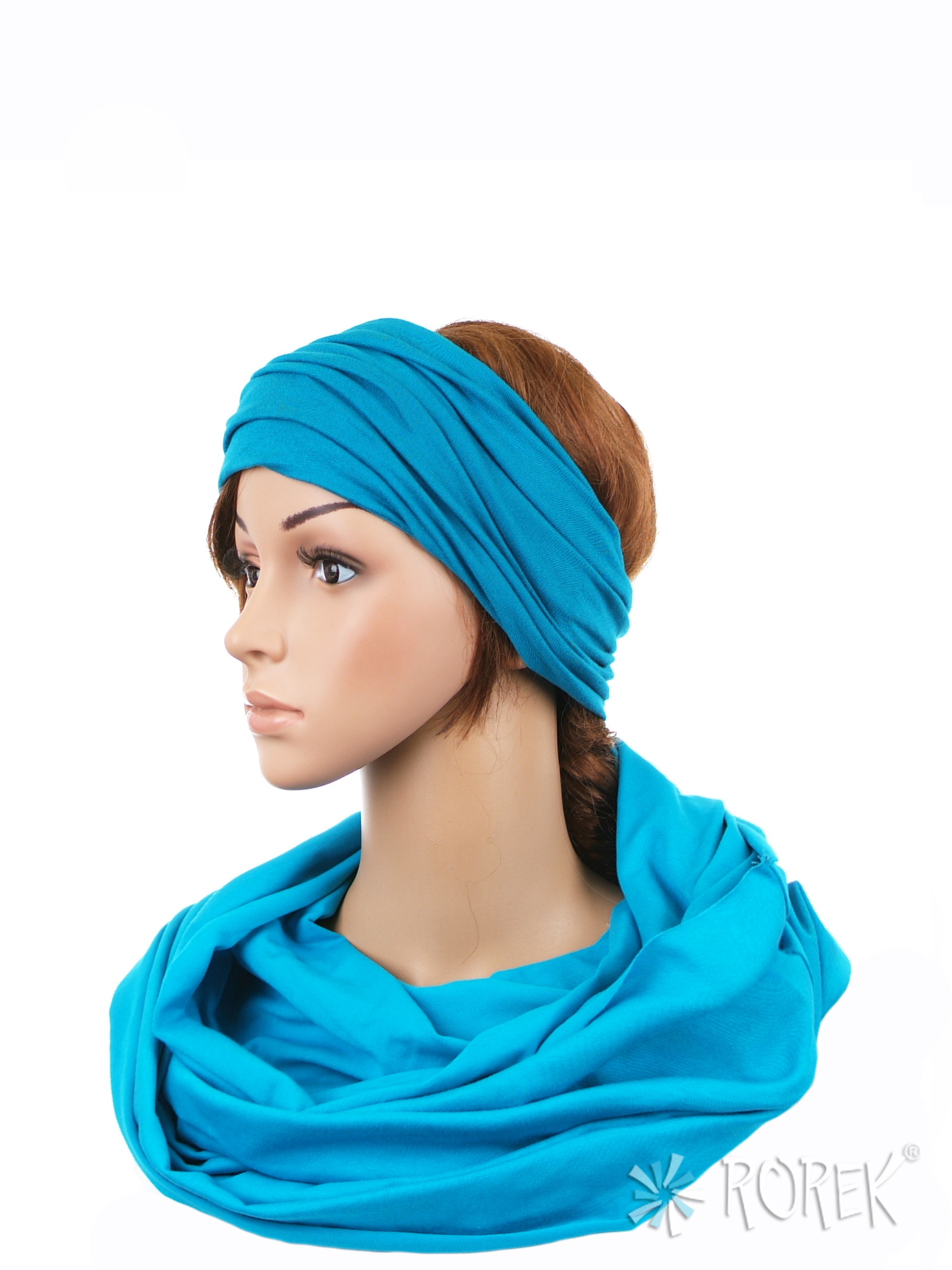 Komin damski wiązany w "ósemkę" w komplecie z szeroką, podwójnie szytą opaską ze ściągaczem - komplet wykonany z delikatnego i bardzo miłego w dotyku materiału 100 % bawełnianego, a dzięki niewielkiej ilości streczu, świetnie się poddaje.