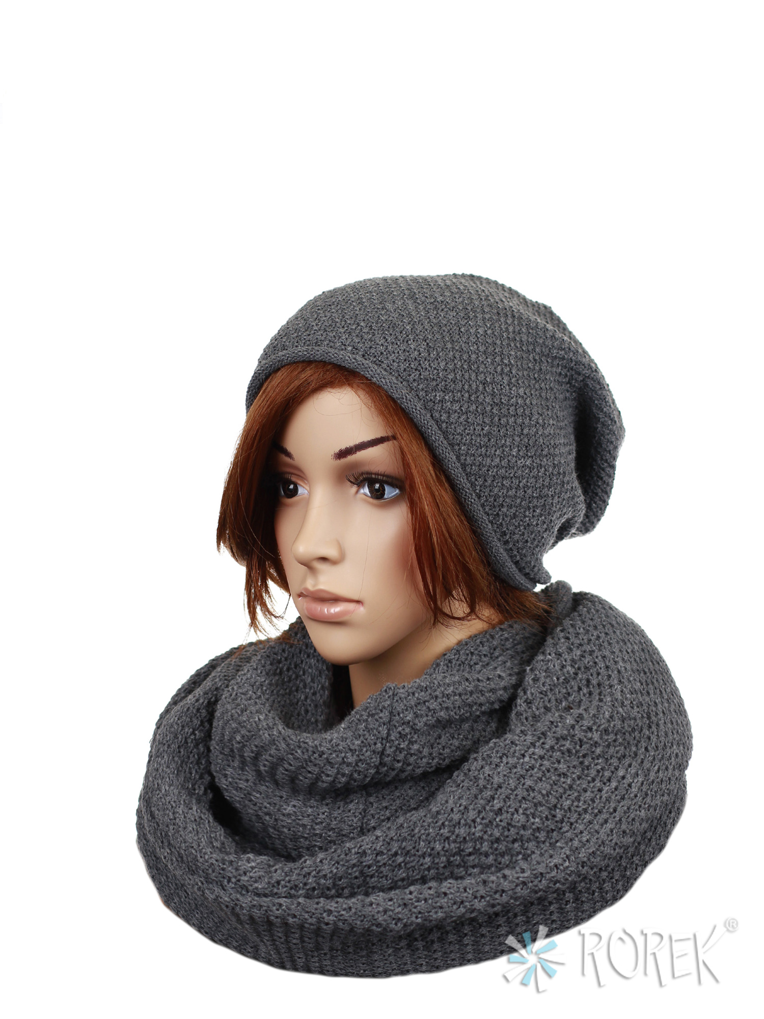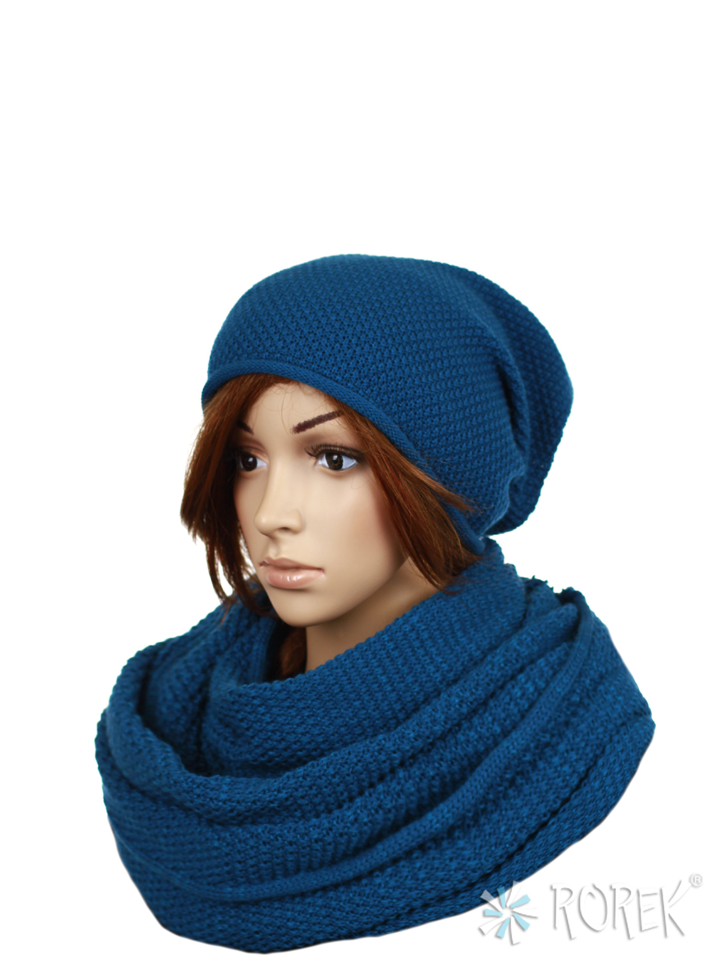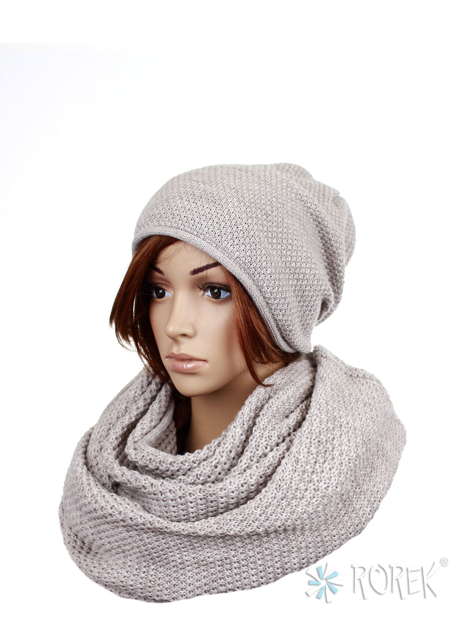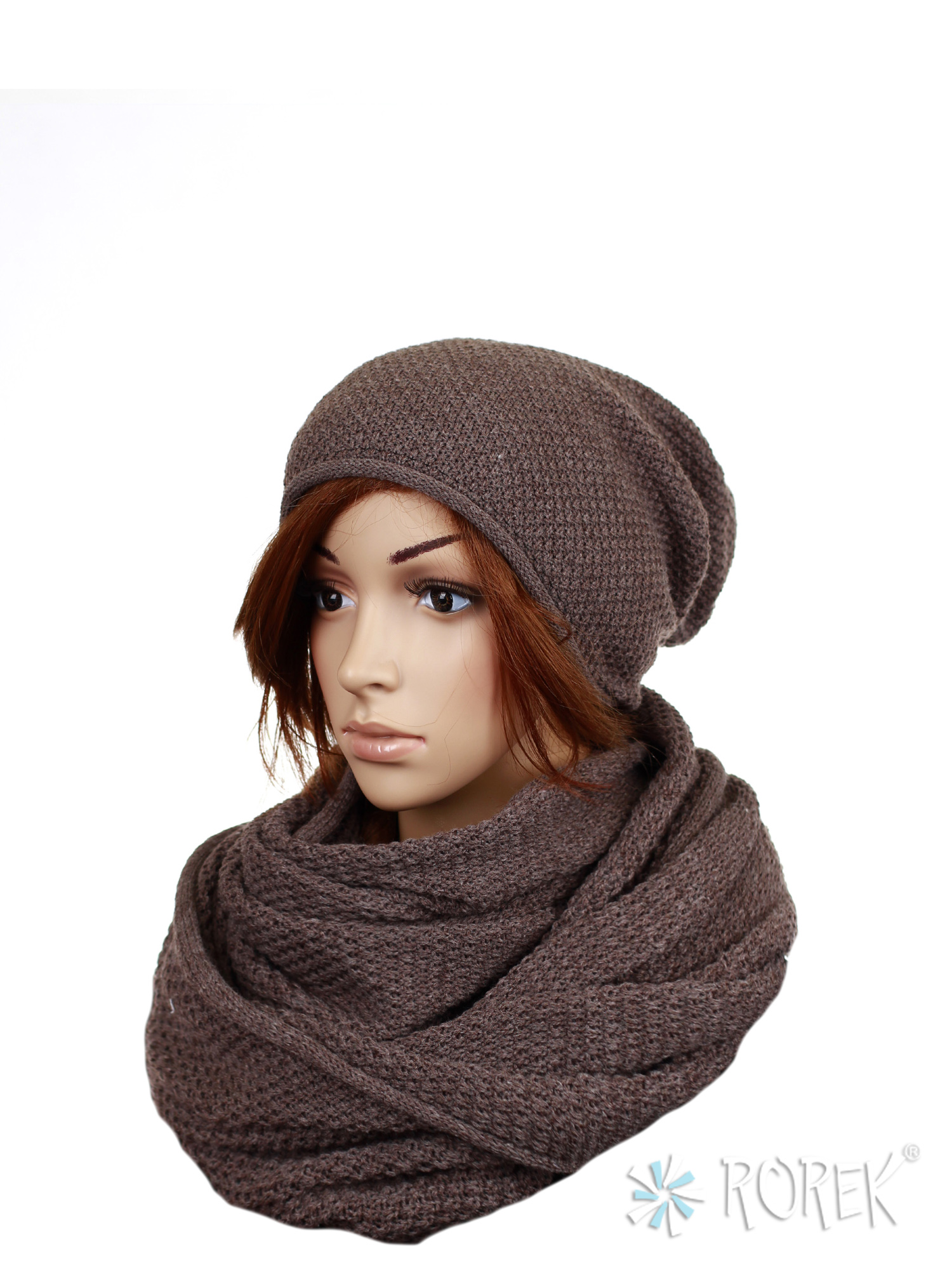 1) Czapka damska przedłużana z tyłu o splocie "ryżu", lekka, szyta z pojedynczej warstwy, dzięki czemu świetnie nadaje się na jesień i lekką zimę.