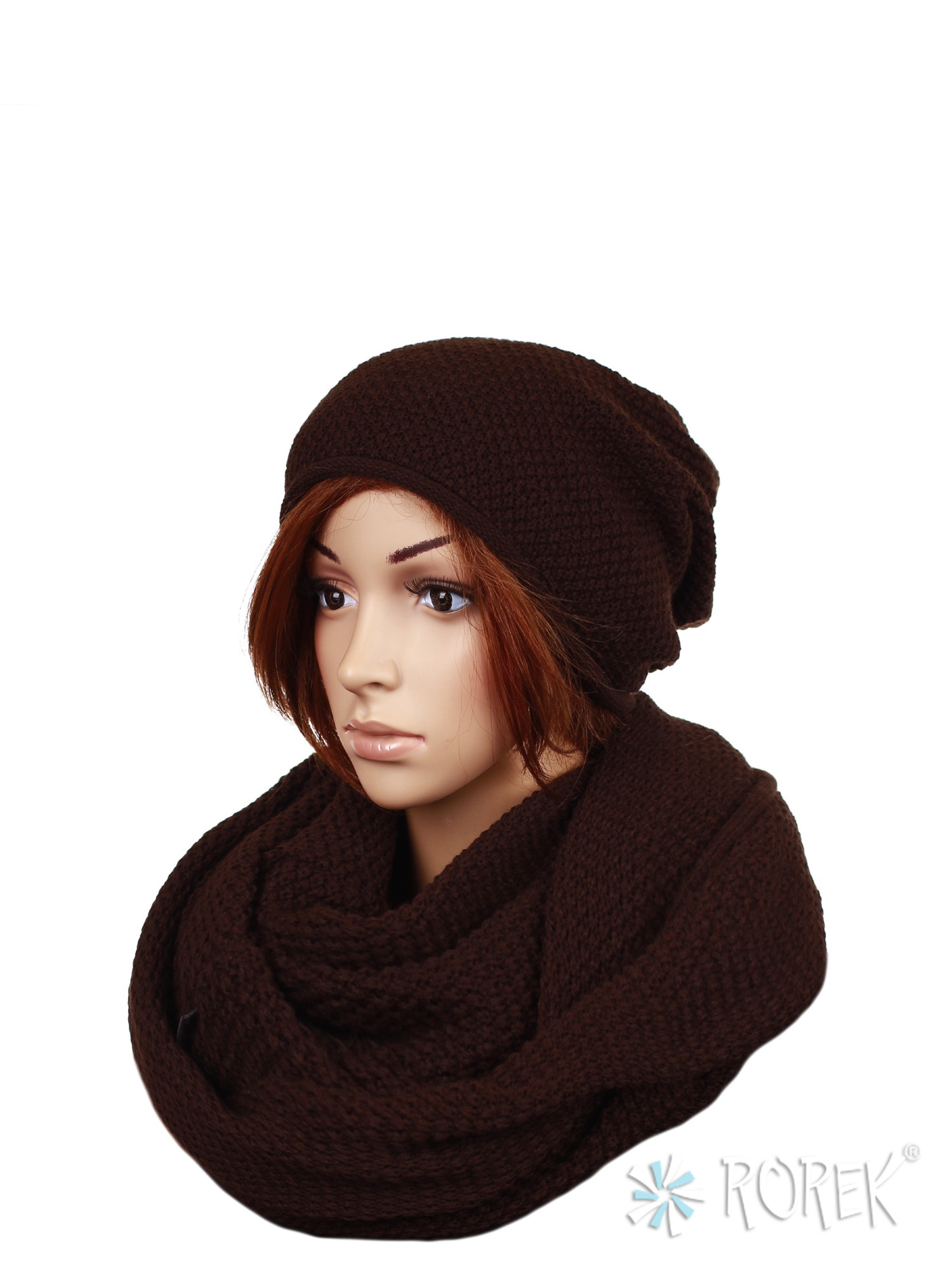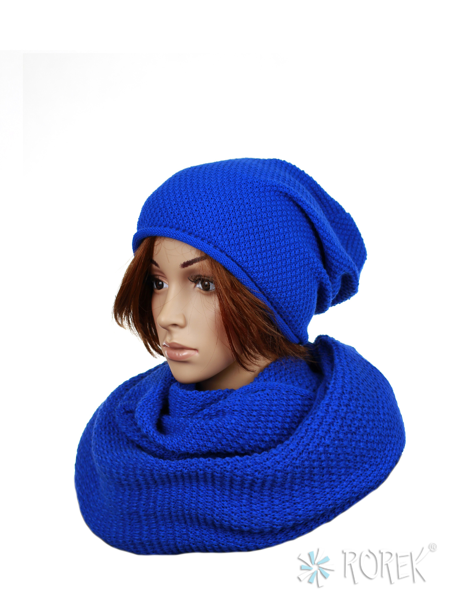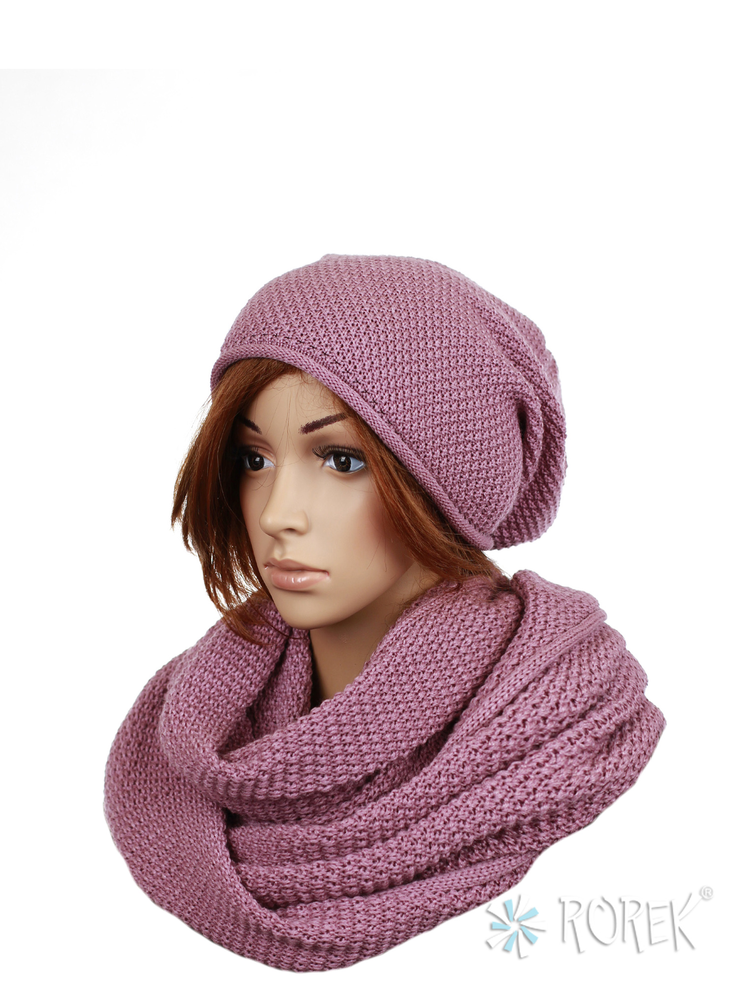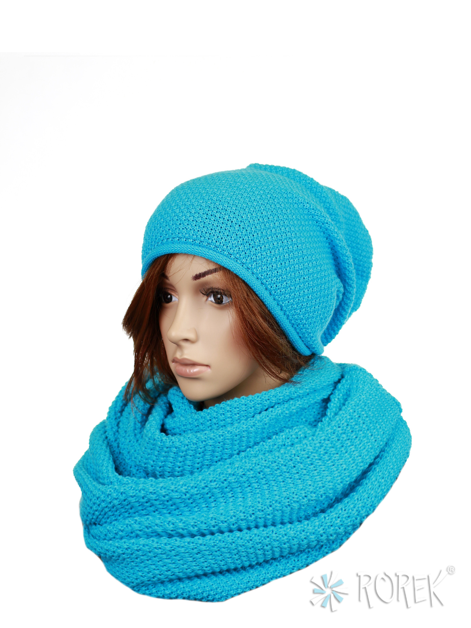 1) Czapka damska przedłużana z tyłu o splocie "ryżu", lekka, szyta z pojedynczej warstwy, dzięki czemu świetnie nadaje się na jesień i lekką zimę.
