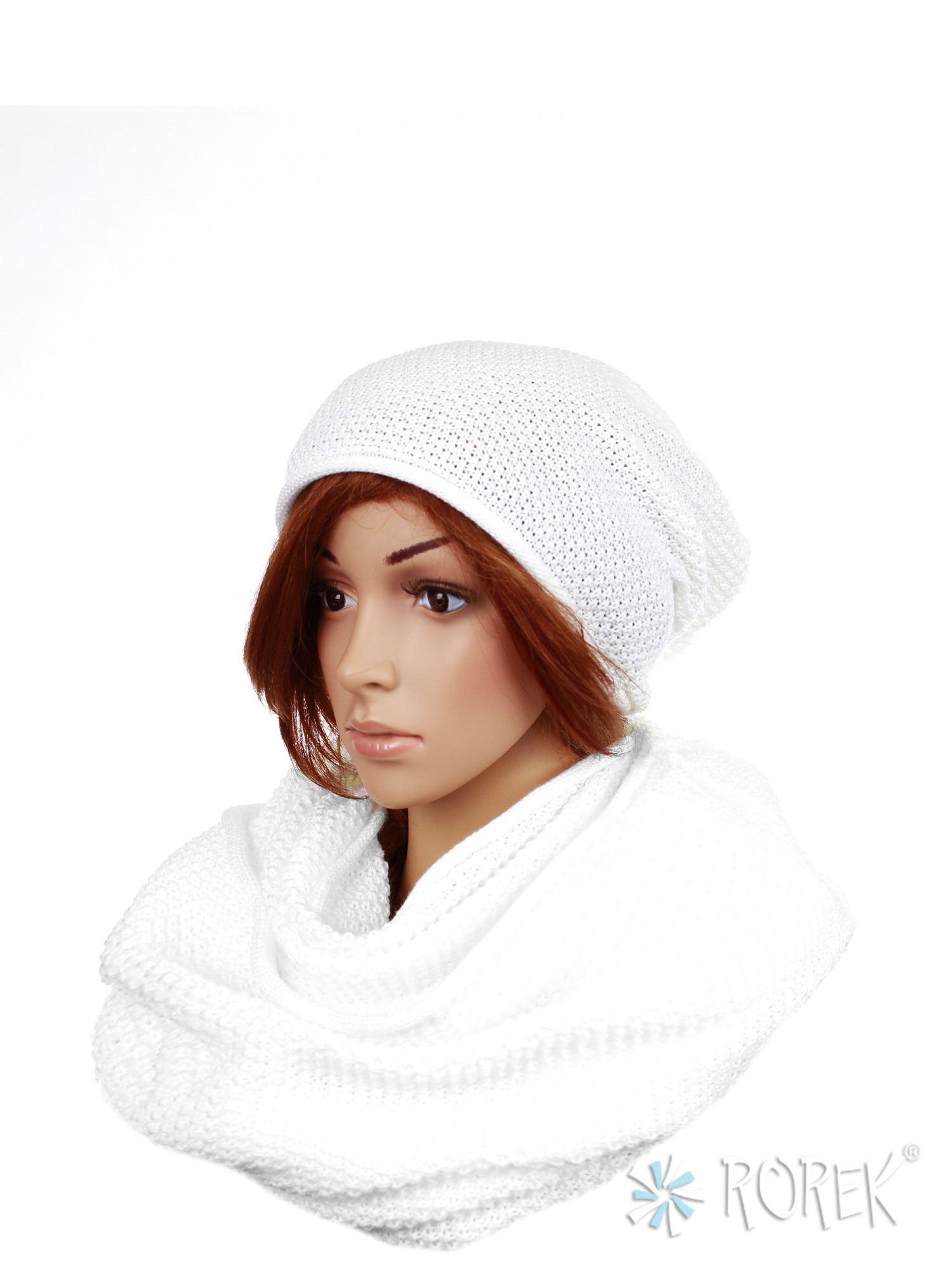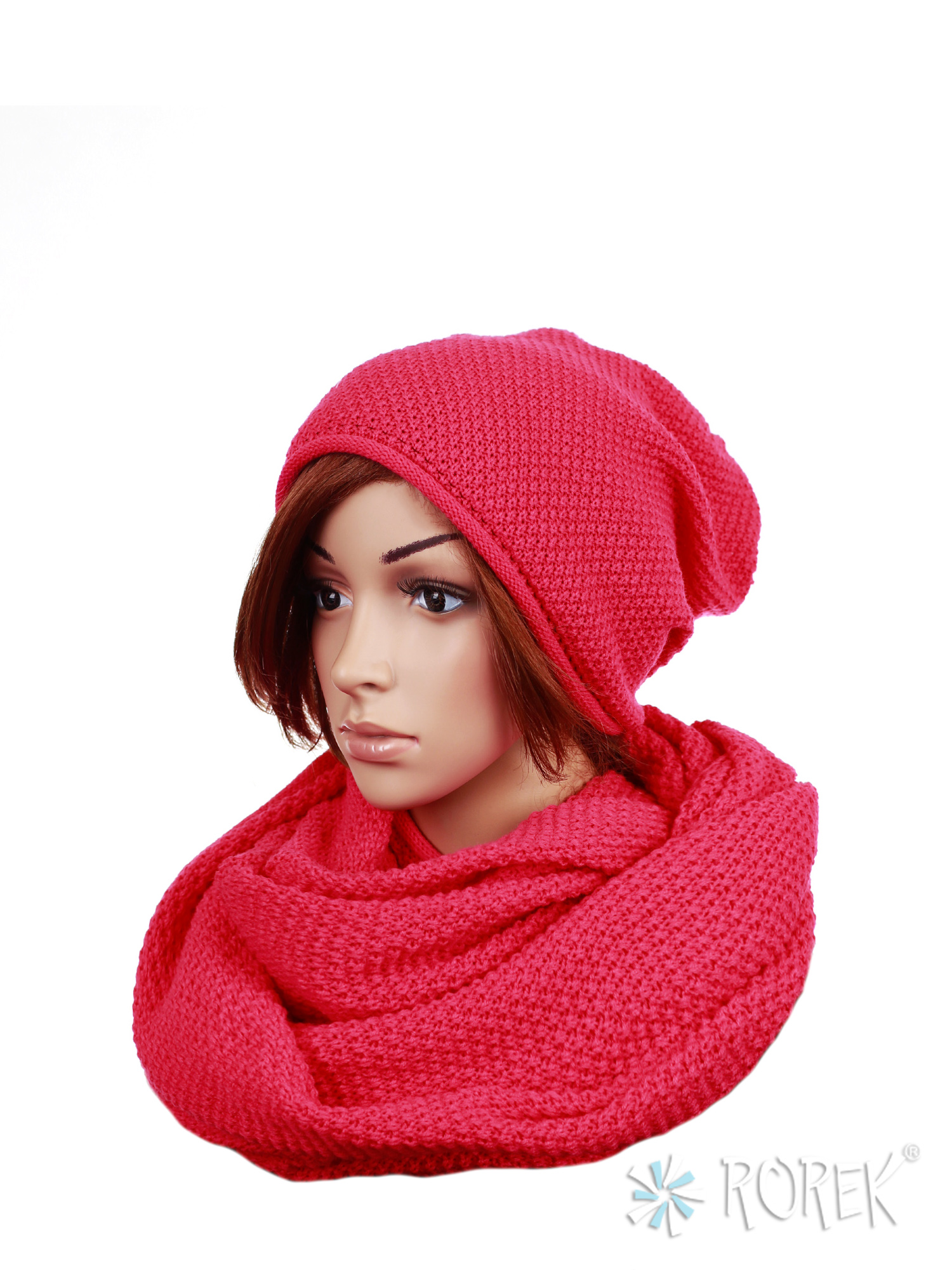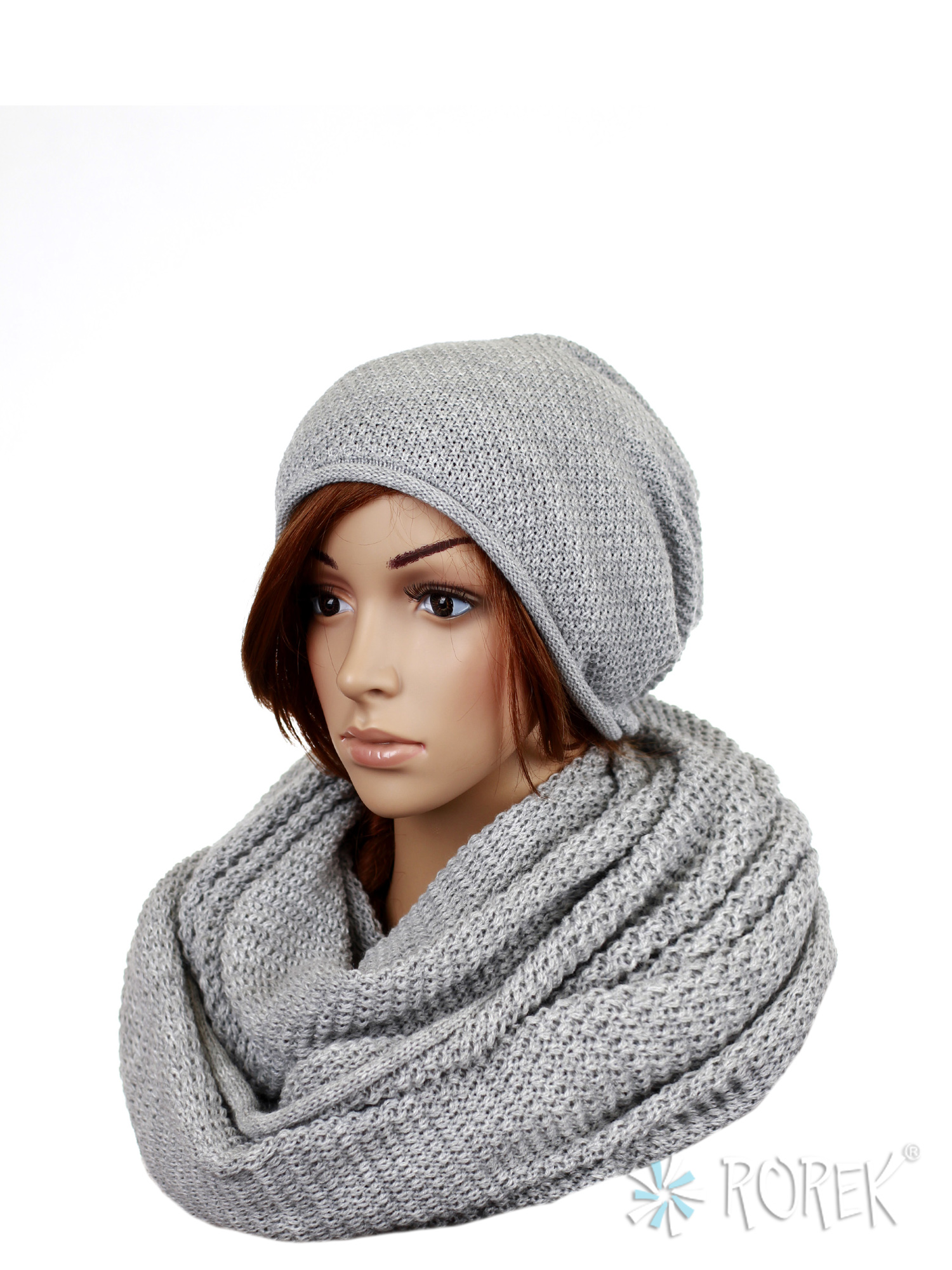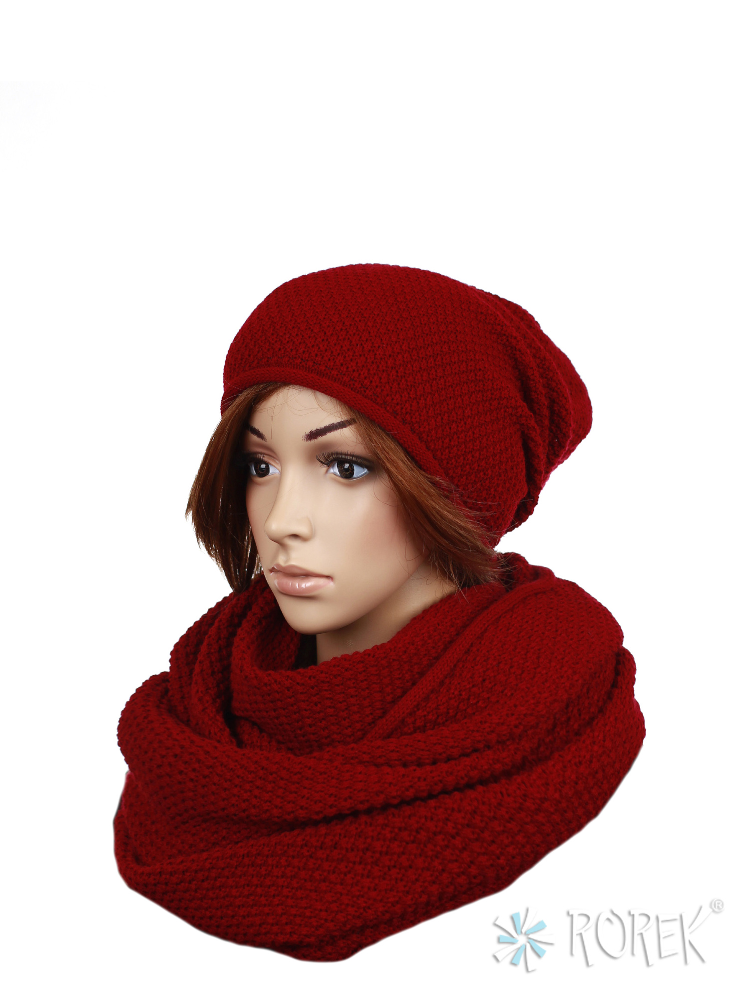 1) Czapka damska przedłużana z tyłu o splocie "ryżu", lekka, szyta z pojedynczej warstwy, dzięki czemu świetnie nadaje się na jesień i lekką zimę.