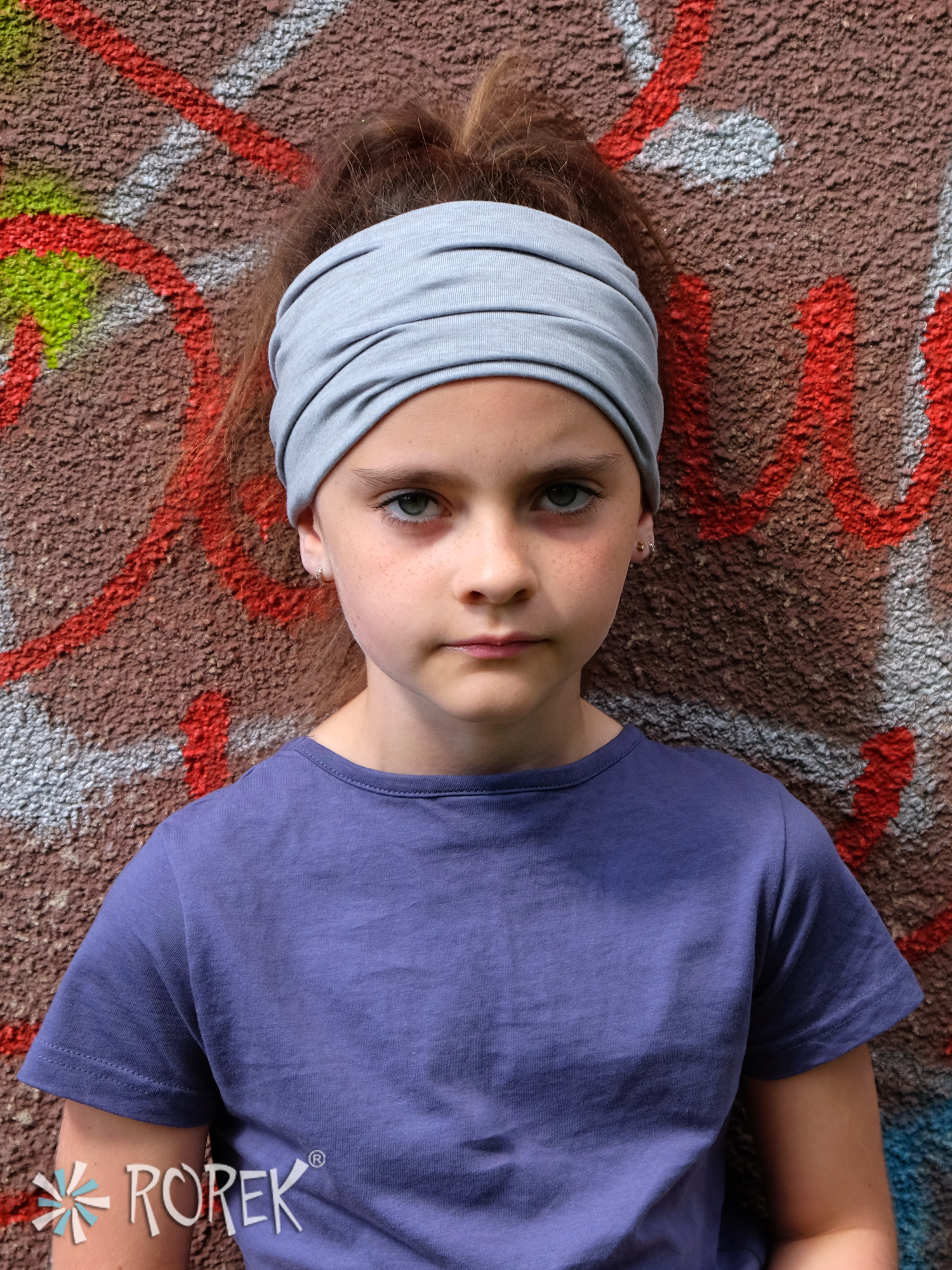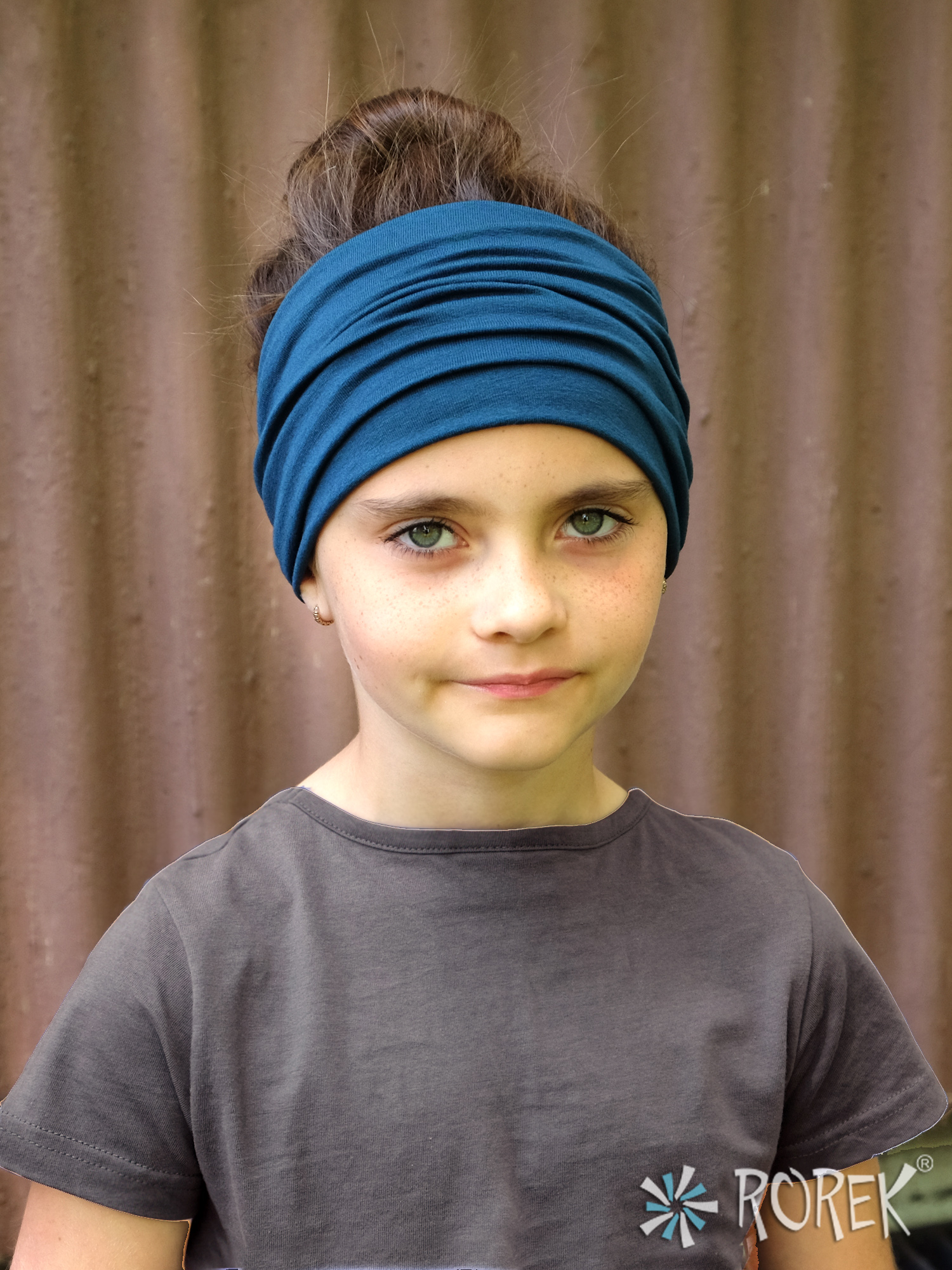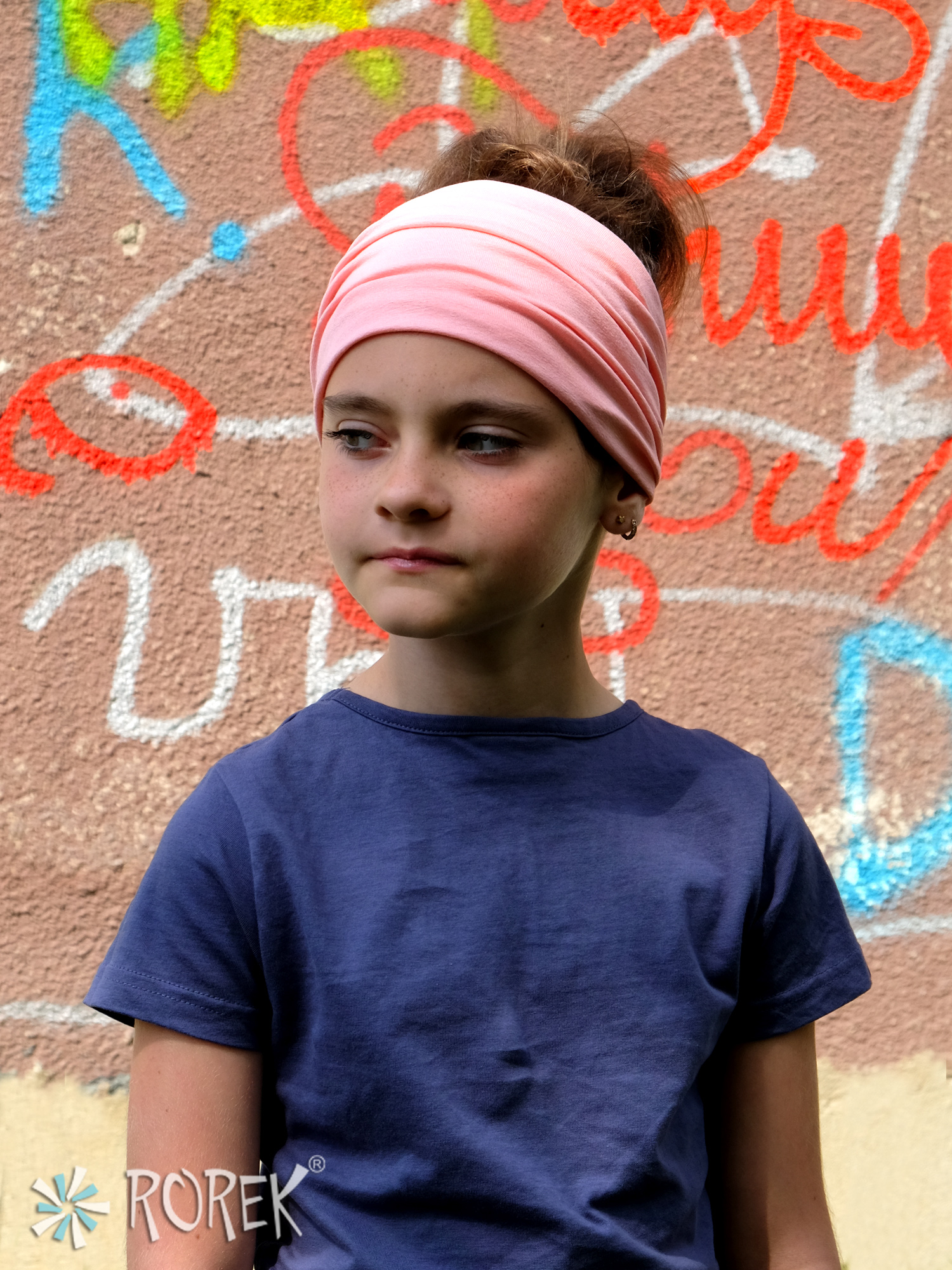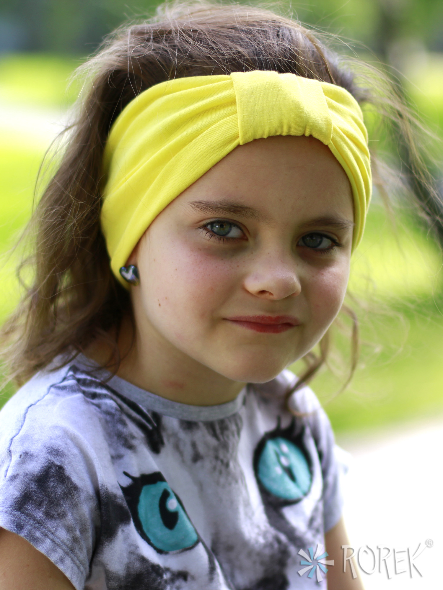 Letnia opaska dziecięca z ozdobnym ściągaczem, delikatnie marszczona, wykonana z lekkiej tkaniny bawełnianej.